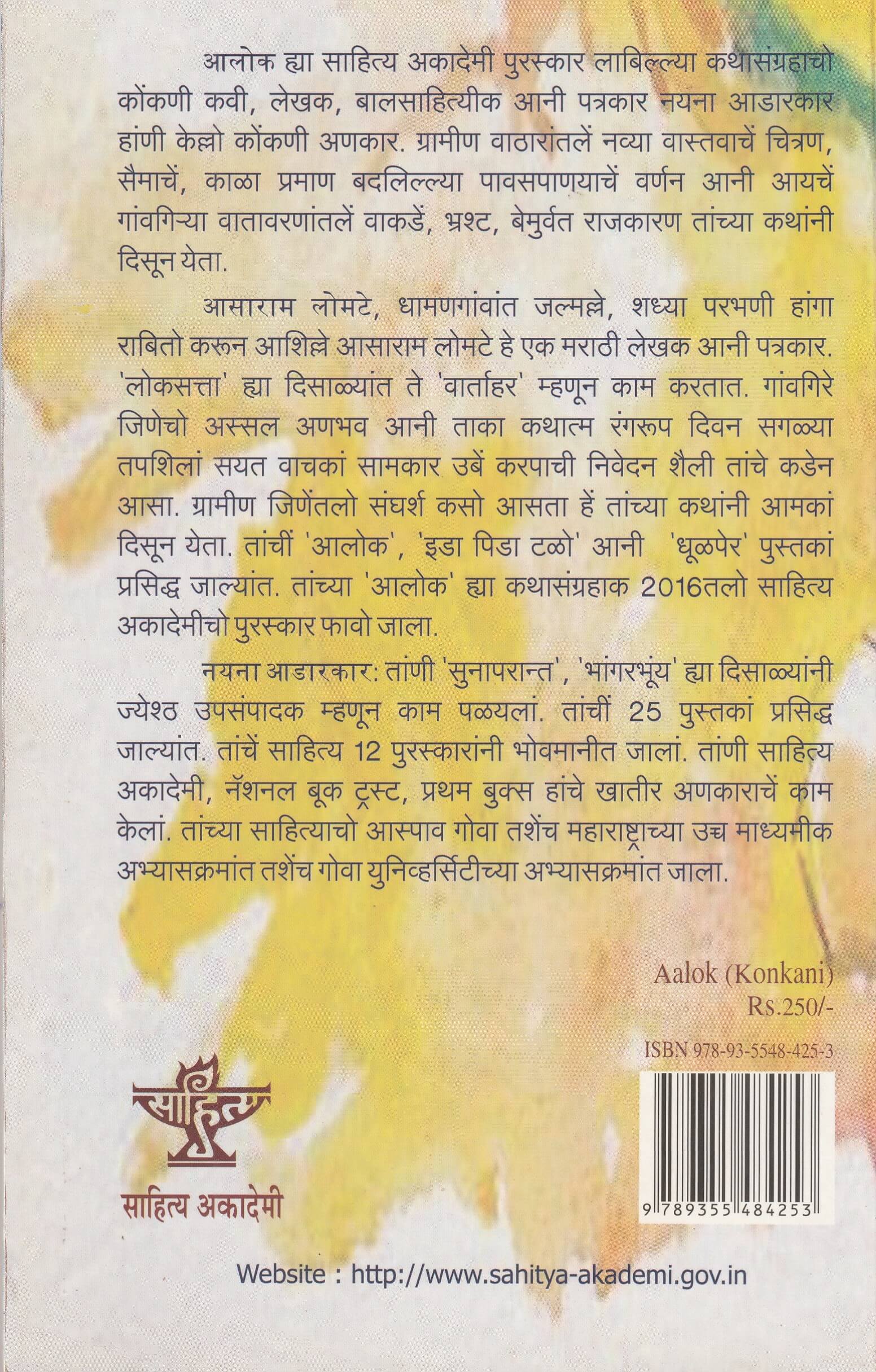 Aalok, a collection of stories that won the Sahitya Akademi Award, translated into Konkani by the Konkani poet, writer, children’s author, and journalist Nayana Adarkar. Her stories depict the new reality of rural areas, the description of nature and weather that changes with time, and the crooked, corrupt, and ruthless politics in today’s rural atmosphere.
