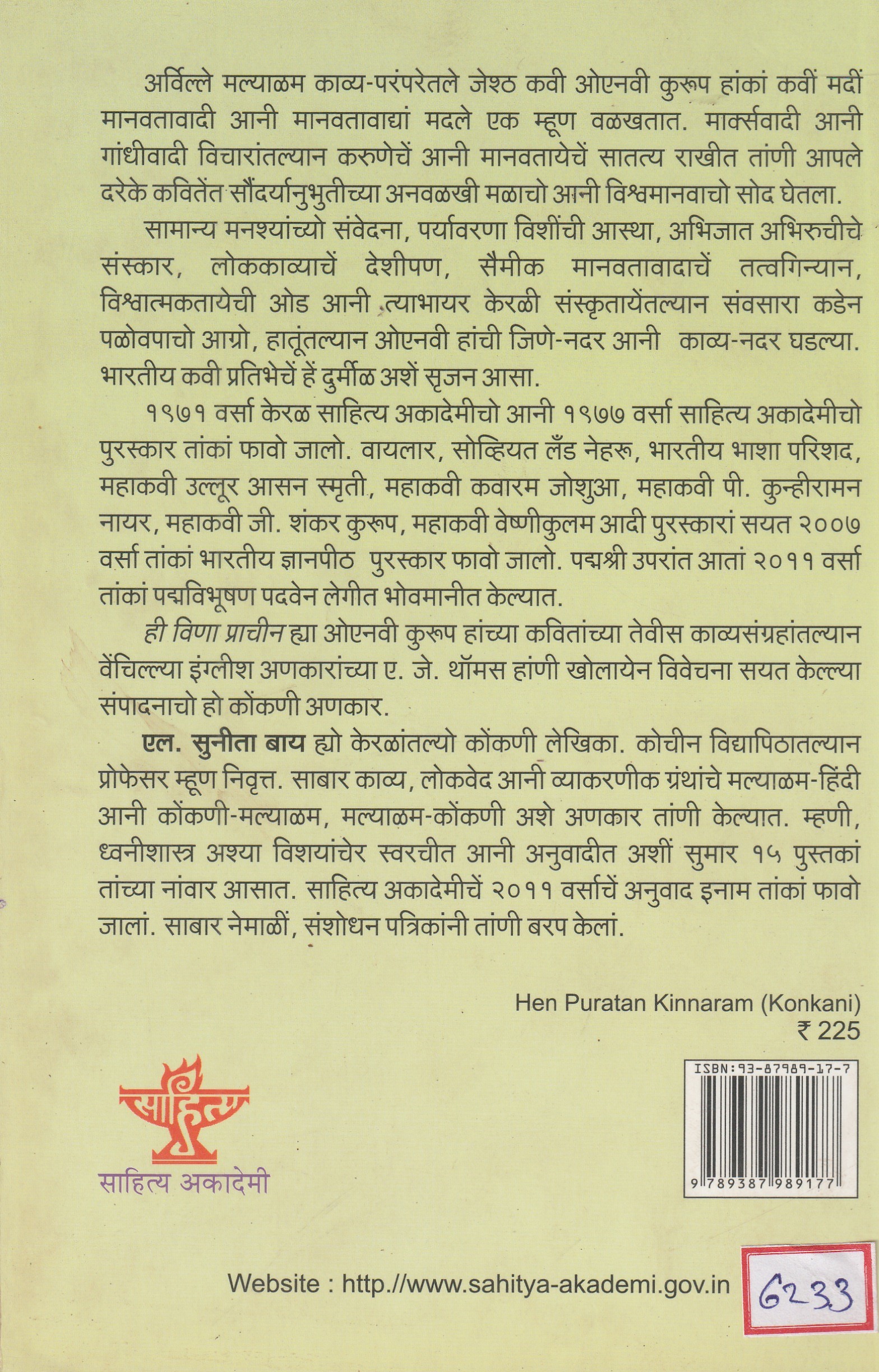 L. Sunita Bai is a Konkani writer from Kerala. Retired as Professor from Cochin University. He has translated many poems, folklore and grammar texts into Malayalam-Hindi and Konkani-Malayalam, Malayalam Konkani. He has written and translated about 15 books on subjects such as proverbs and phonetics. He has been awarded the 2011 Sahitya Akademi Translation Prize. He has written in numerous journals and research papers.