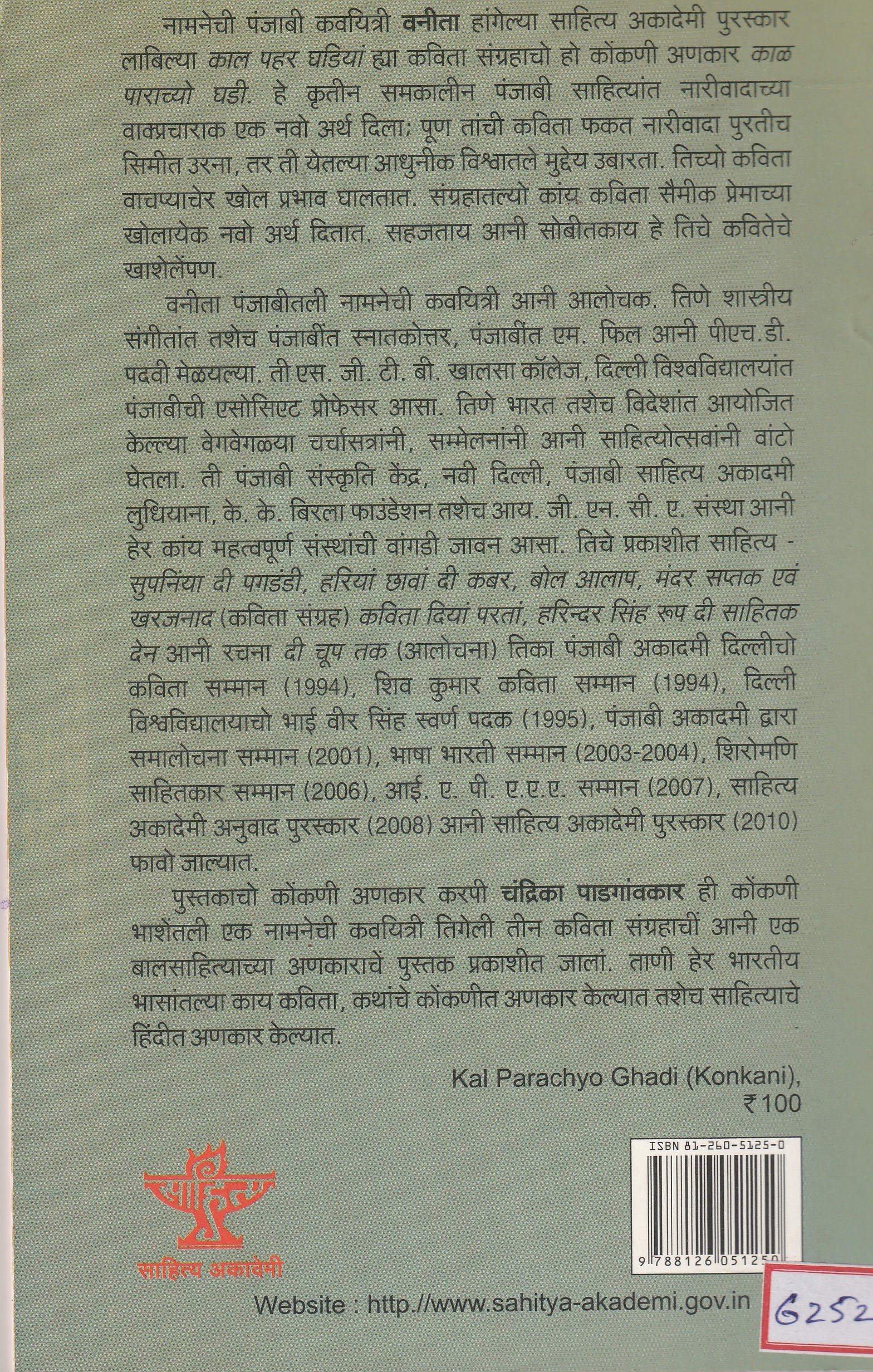 This is the Konkani translation of the Sahitya Akademi Award winning collection of poems Kal Pahar Ghadiyan by renowned Punjabi poet Vanita, Kal Parache Ghadi. This work has given a new meaning to the rhetoric of feminism in contemporary Punjabi literature: but their poetry is not limited to feminism, it also raises issues in the coming modern world